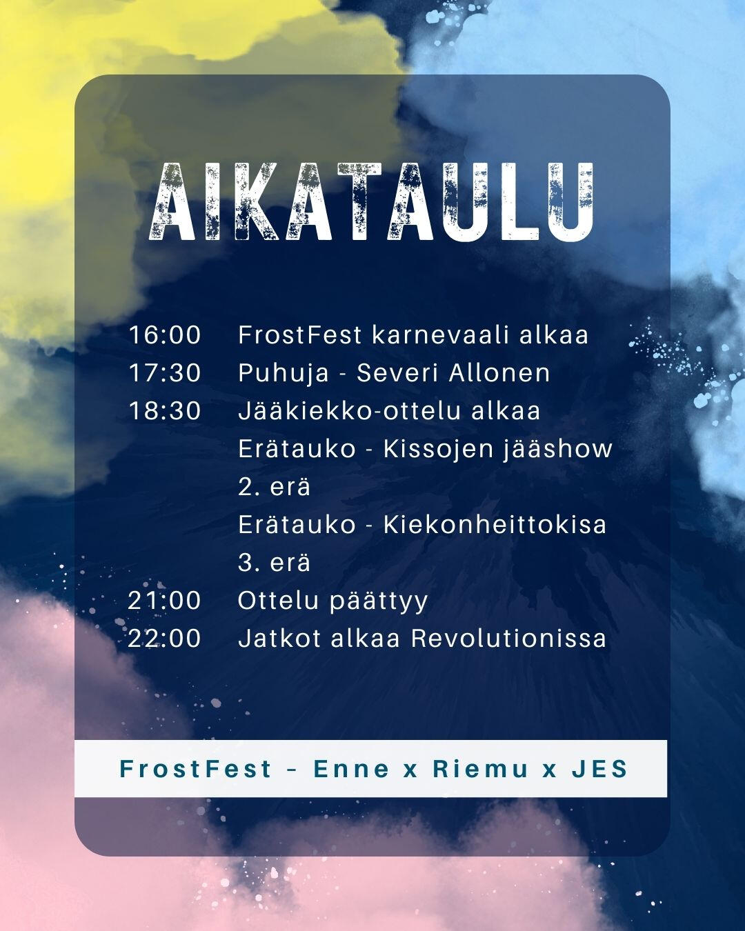 FrostFest syntyi halusta juhlia syksyn alkua yhdessä.Tapahtuman ytimessä ovat liikunnan ilo, yhteisöllisyys ja matalan kynnyksen kohtaamiset. Olitpa sitten intohimoinen urheilija, satunnainen penkkiurheilija tai vain fiilistä hakeva opiskelija, tämä tapahtuma on sinulle!FrostFest on suunnattu kaikille JYU:n, Jamkin ja Gradian sekä Jyväskylän alueella oleville opiskelijoille, ja mukaan mahtuu myös ilman opiskelijastatusta. Tapahtumamme on tarkoitus olla avoin ja mahdollistaa moninaiset kaveriporukat sekä yhteisöt elämäntilanteidensa yli osallistumaan!Meille tärkeintä on, että jokainen tuntee olonsa tervetulleeksi. Voit osallistua tapahtumaan haluamallasi tavalla: kannustaen, omia taitojasi testaillen, katsellen tai vain olemalla mukana.Tervetuloa mukaan rakentamaan Jyväskylän suurinta opiskelijasyksyn starttia!